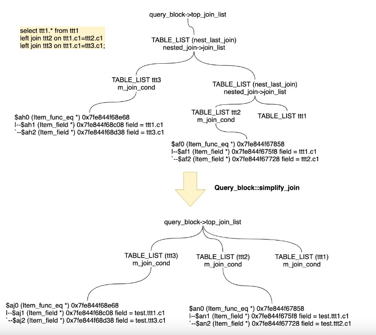 该函数会把Query_block中的top_join_list的嵌套join的简化为扁平化的join list。嵌套连接包括table1 join table2,也包含table1, (table2, table3)这种形式。如果所示的简化过程: