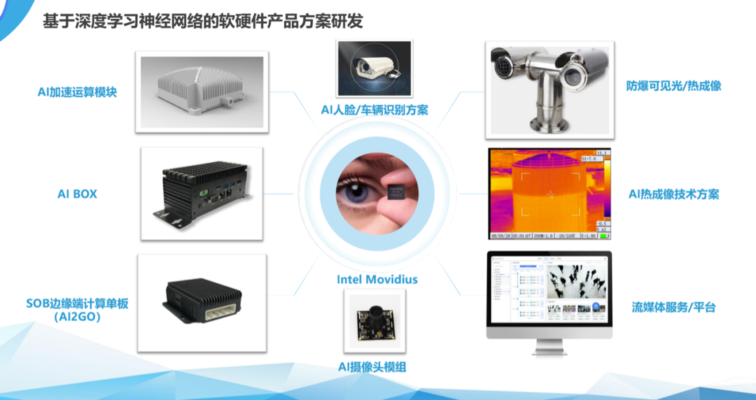 公司现已开发人工智能单目摄像机、双目摄像机、双目测温摄像机、双通道Smart Box、四通道Smart Box、视觉AI核心板Smart Core、人工智能运算加速器B38X、车载8路1080P视频机等硬件产品,以及视频监控综合管理平台、流媒体服务系统等软件服务平台。