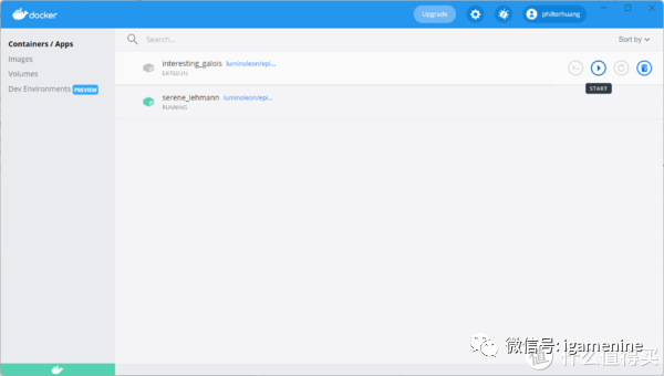 运行过的docker app,会在docker 桌面端显示。如下图所示,文章中,我执行了两次领取游戏的命令,页面显示了两个app。