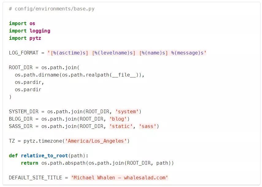 从开发者的角度来看,我们想要像这样访问我们的配置:上面的导入行不包含任何能提示我们所处环境的内容。我们在任何地方都没有看到development或production这样的词。相反,我们只导入了我们需要的,并允许配置系统来决定它来自何处。我们利用文件系统和语言本身来提供一个用于读取配置的API。- common.py包含我们所有的公共或共享配置。这些东西在不同的环境中并没有太大的不同。你可以称其为base或shared配置,如果你愿意。