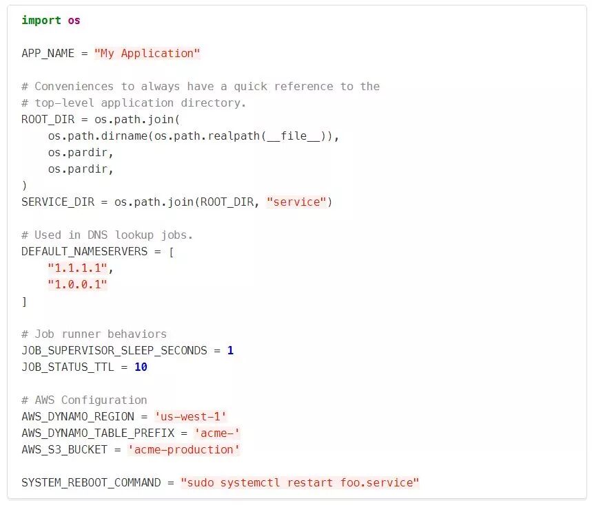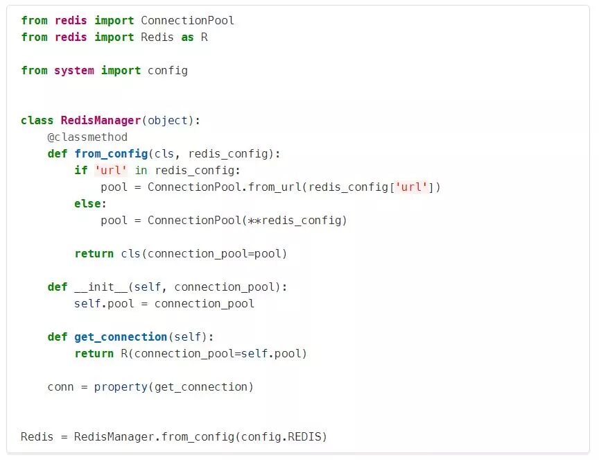 最后,为了演示如何在应用程序的其他地方使用这个设置,我们来看看Redis连接是如何建立的:注意最后一行:RedisManager.from_config()用于隔离关注点。RedisManager的其余部分不知道config中的数据是什么样子的,也不需要知道。这是配置层和系统其余部分之间的一个切换点。结论