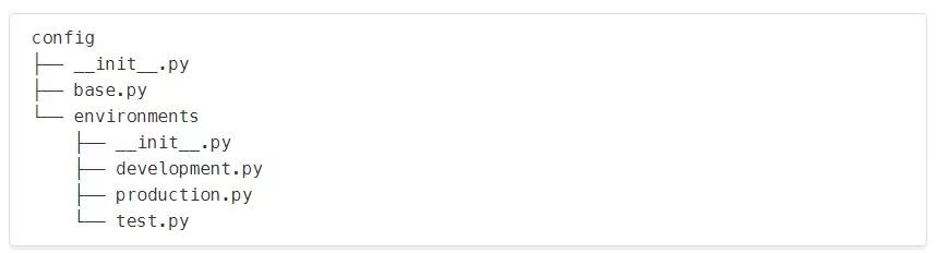 - environments/development.py包含开发配置。该文件可以排除在版本控制之外,这样团队中的每个开发人员都可以实现自己的配置设置。