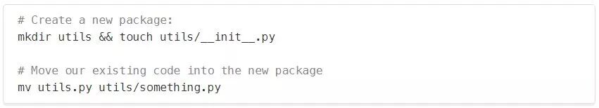 我最喜欢的Python特性之一是,构成你应用程序的文件和目录与你在代码中导入和使用它们的方式是一一对应的。许多语言和框架都依赖于这个新概念,包括Clojure和ES6。在我们的示例中,Python将utils目录视为一个Package。当你在一个目录中放置一个空的__init__.py时,该目录就变成了一个包。作为一名Python黑客,你可能会遇到这样一个常见的场景,其中有一个utils.py文件最终会变得太大,因此你将它拆分成一个包含许多较小文件的utils//目录。所以现在我们已经看到了一个Python包是由一个目录中是否存在一个__init__.py文件决定的…但是如果这个文件不是空的呢?在__init__.py中放入代码