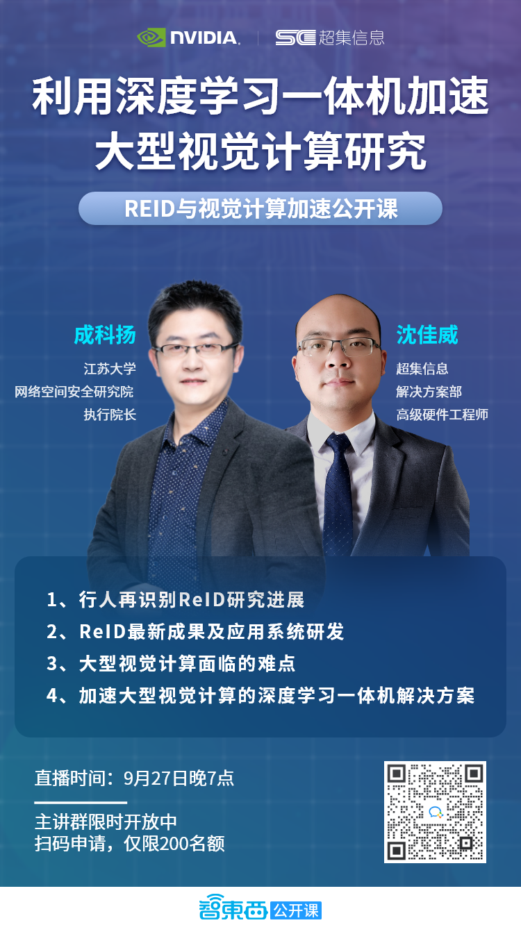 9月27日晚7点,超集信息专场的第四讲将正式开讲。本次专场定名为「ReID与视觉计算加速公开课」,将由江苏大学网络空间安全研究院执行院长成科扬、超集信息解决方案部高级硬件工程师沈佳威共同主讲,主题为《利用深度学习一体机加速大型视觉计算研究》。