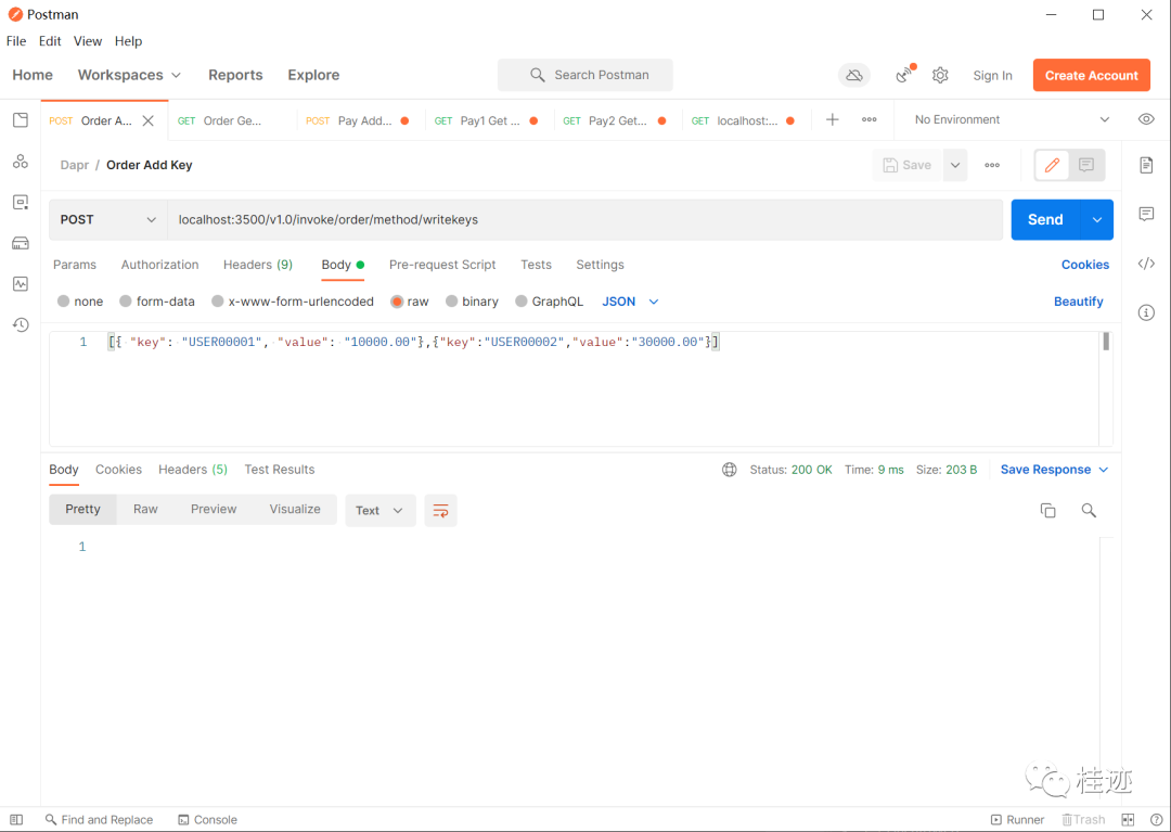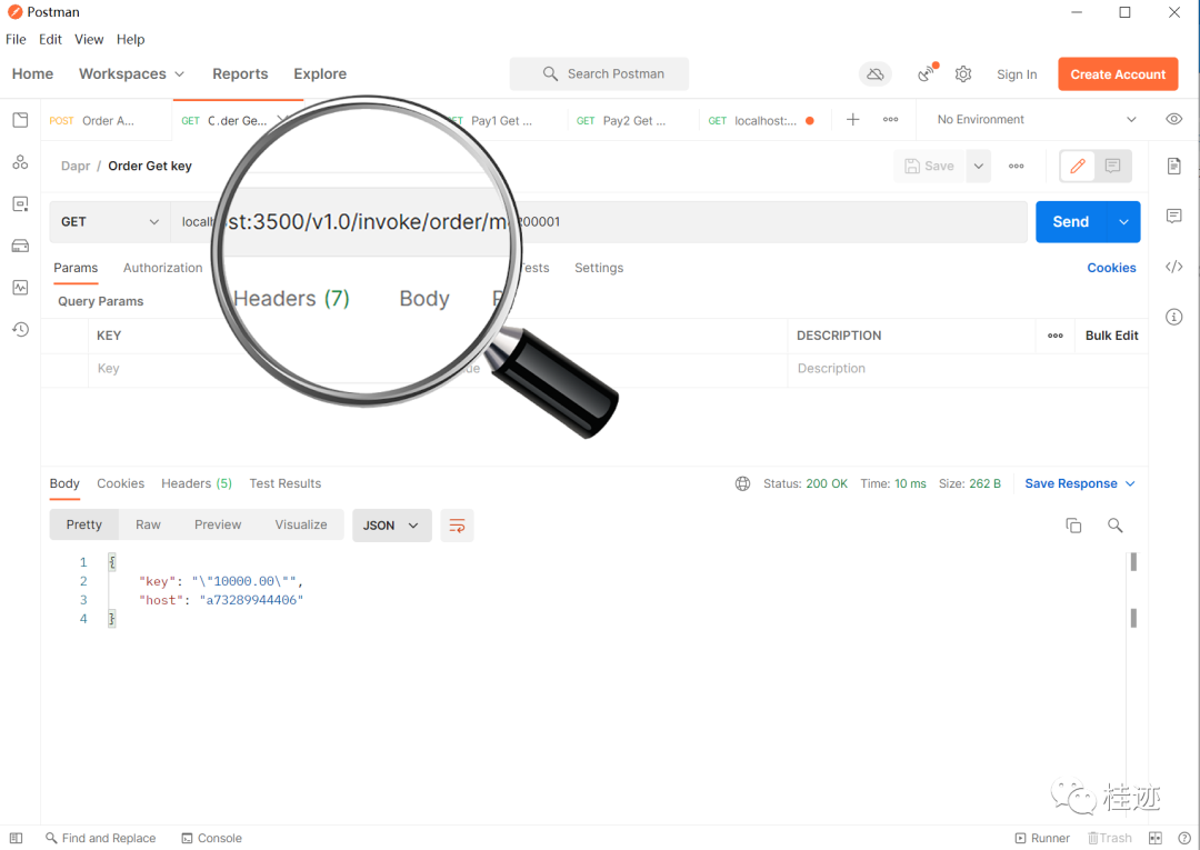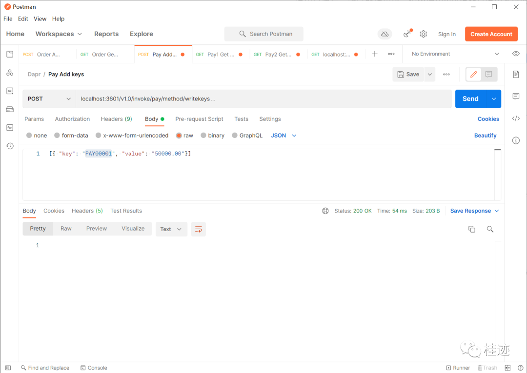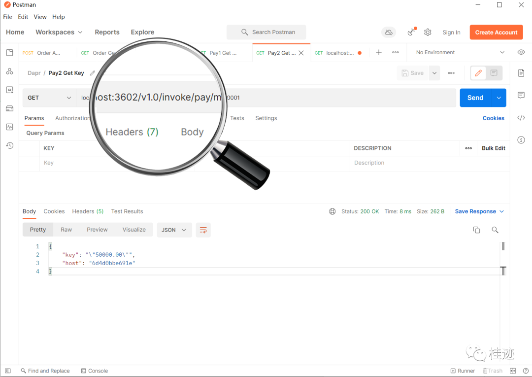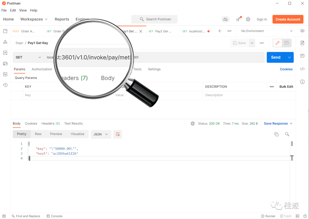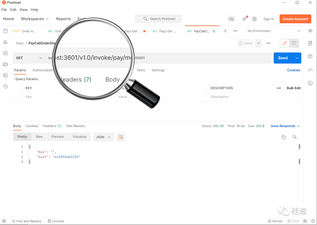 下面换成从pay1服务的3601中访问order服务的状态,结果有值,url为localhost:3601/v1.0/invoke/order/method/readekey/USER00001,根本原因可能你想到了,这本质上调的还是order服务的接口,只不过是利用pay1的sidecar调用order的sidecar实现的,因为服务调用是通着,所以能调用到,这里可以通过查看返回的host值证明。