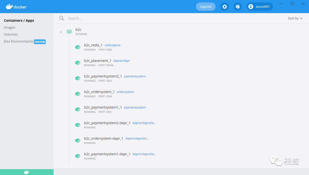 docker-compose.yml,这里定义了一个b2c-dapr,作为互通网络,打通应用与redis等服务的通道。其中ordersystem对宿主机的端口还是3500,paymentsystem对宿主机的端口分别是3601,3602