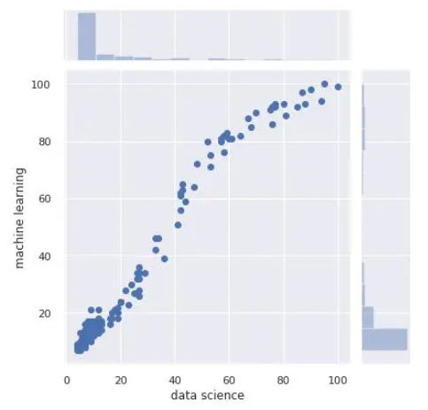 sns.jointplot(x='data science', y='machine learning', data=df)
