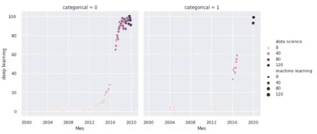 sns.relplot(x='Mes', y='deep learning', hue='data science', size='machine learning', col='categorical', data=df)