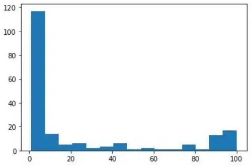 plt.hist(df ['deep learning'],bins = 15)