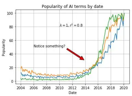 plt.title('Popularity of AI terms by date')