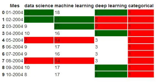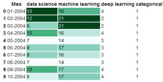 df.head(10).style.format(format_dict).background_gradient(subset=['data science', 'machine learning'], cmap='BuGn')