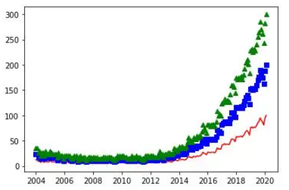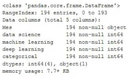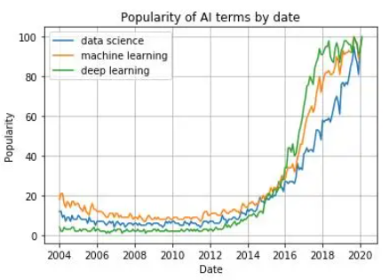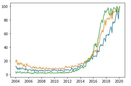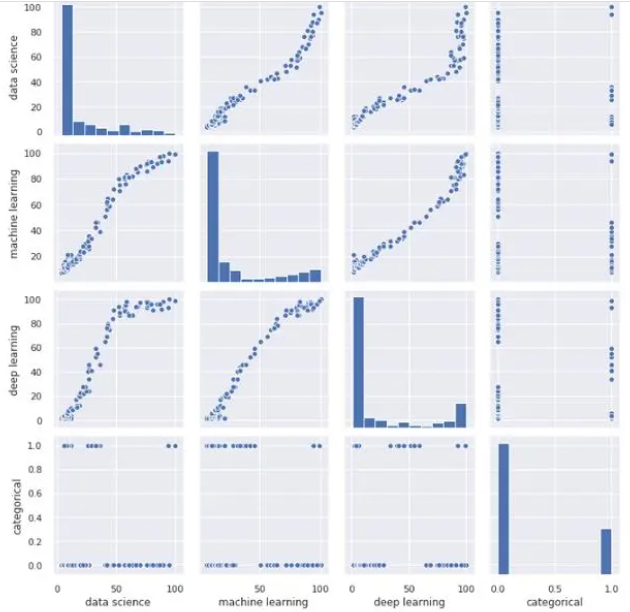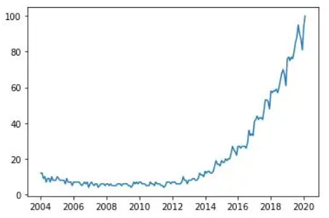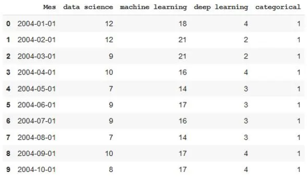今天让我们看一下使用Python进行数据可视化的主要库,以及可以使用它们完成的所有类型的图表。我们还将看到建议在每种情况下,使用哪个库以及每个库的独特功能。我们将从最基本的可视化开始,直接查看数据,然后继续绘制图表,最后制作交互式图表。我们将使用两个数据集来适应本文中显示的可视化效果,数据集可通过下方链接进行下载。数据集:github.com/albertsl/datasets这些数据集都是与人工智能相关的三个术语(数据科学,机器学习和深度学习)在互联网上搜索流行度的数据,从搜索引擎中提取而来。该数据集包含了两个文件temporal.csv和mapa.csv。在这个教程中,我们将更多使用的第一个包括随时间推移(从2004年到2020年)的三个术语的受欢迎程度数据。另外,我添加了一个分类变量(1和0)来演示带有分类变量的图表的功能。mapa.csv文件包含按国家/地区分隔的受欢迎程度数据。在最后的可视化地图时,我们会用到它。