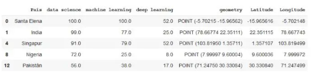 在开头提供的数据集中,我们有国家名称和人工智能术语的流行度。快速可视化后,您会发现有些国家缺少这些值之一。我们将消除这些国家,以使其变得更加容易。然后,我们将使用Geopandas将国家/地区名称转换为可在地图上绘制的坐标。
