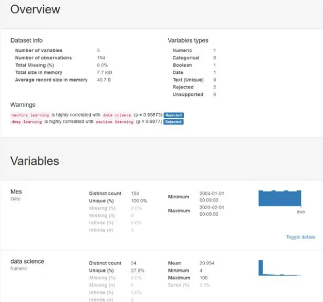 Pandas分析是一个库,可使用我们的数据生成交互式报告,我们可以看到数据的分布,数据的类型以及可能出现的问题。它非常易于使用,只需三行,我们就可以生成一个报告,该报告可以发送给任何人,即使您不了解编程也可以使用。