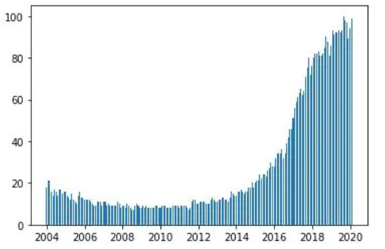 plt.bar(df ['Mes'],df ['machine learning'],width = 20)