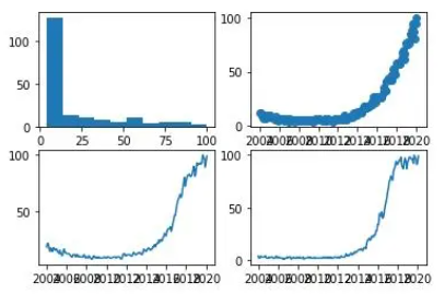 如果您是从终端或脚本中使用Python,则在使用我们上面编写的函数定义图后,请使用plt.show()。如果您使用的是Jupyter Notebook,则在制作图表之前,将%matplotlib内联添加到文件的开头并运行它。我们可以在一个图形中制作多个图形。这对于比较图表或通过单个图像轻松共享几种图表类型的数据非常有用。
