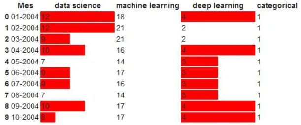 df.head().style.format(format_dict).bar(color='red', subset=['data science', 'deep learning'])