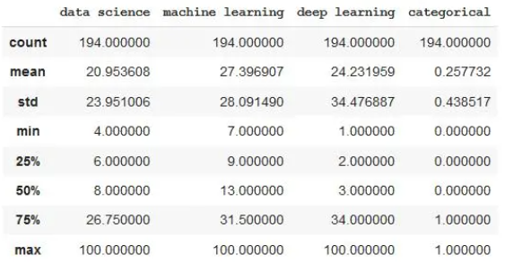 使用命令描述,我们将看到数据如何分布,最大值,最小值,均值……