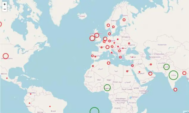 现在,我们已经按照纬度和经度对数据进行了编码,现在让我们在地图上进行表示。我们将从BubbleMap开始,在其中绘制各个国家的圆圈。它们的大小将取决于该术语的受欢迎程度,而颜色将是红色或绿色,具体取决于它们的受欢迎程度是否超过某个值。