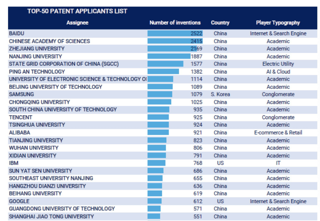 报告显示,全球深度学习专利申请量排名前50位的机构中有43家来自中国,表明中国在该领域的专利布局中取得了显著优势,百度、中国科学院、浙江大学位列前三。其中,百度以2522件的专利申请量升至世界第一,领先于谷歌、微软、Facebook、三星等强力竞争对手。