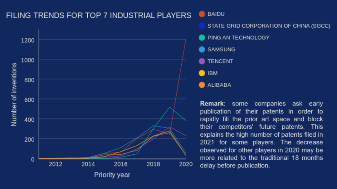 2011-2020年核心创新主体深度学习全球专利申请趋势(来源:Questel)