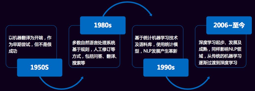 自然语言的发展历程经历了以下几个阶段。这里值得一提的是,关于语言模型,早在2000年,百度IDL的徐伟博士提出了使用神经网络来训练二元语言模型,随后Bengio等人在2001年发表在NIPS上的文章《A Neural Probabilistic Language Model》,正式提出神经网络语言模型(NNLM),在训练模型的过程中也能得到词向量。2007年,Mnih和Hinton在神经网络语言模型(NNLM)的基础上提出了log双线性语言模型(Log-Bilinear Language Model,LBL),同时,Hinton在2007年发表在 ICML 上的《Three new graphical models for statistical language modelling》初见其将深度学习搬入NLP的决心。