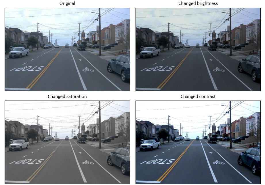 def colorjitter(img, cj_type="b"):'''    ### Different Color Jitter ###img: imagecj_type: {b: brightness, s: saturation, c: constast}'''if cj_type == "b":        # value = random.randint(-50, 50)value = np.random.choice(np.array([-50, -40, -30, 30, 40, 50]))hsv = cv2.cvtColor(img, cv2.COLOR_BGR2HSV)h, s, v = cv2.split(hsv)if value >= 0:lim = 255 - valuev[v > lim] = 255v[v <= lim] += valueelse:lim = np.absolute(value)v[v < lim] = 0v[v >= lim] -= np.absolute(value)