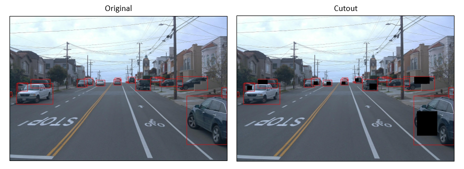 如本文所述,断流器被用于提高图像识别(分类)的准确性,因此,如果我们将相同的方案部署到对象检测数据集中,可能会导致丢失对象的问题,尤其是小对象。下图中,剪切区域(黑色区域)内的大量的小物体被去除了,这不符合数据扩充的目的。