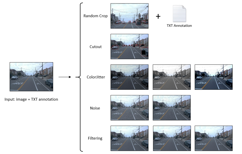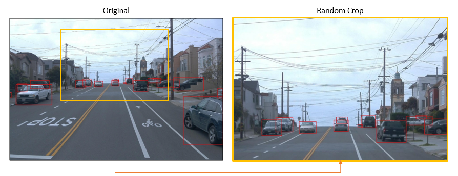 从上图中,左图表示带有真实边界框(红色)的原始图像,右图是通过裁剪橙色框内的区域创建的新样本。在新样本的注释中,去除左图中与橙色框不重叠的所有对象,并细化位于橙色框边界上的对象的坐标以适合新图像样本,原始图像随机裁剪的输出为新裁剪图像及其注释。