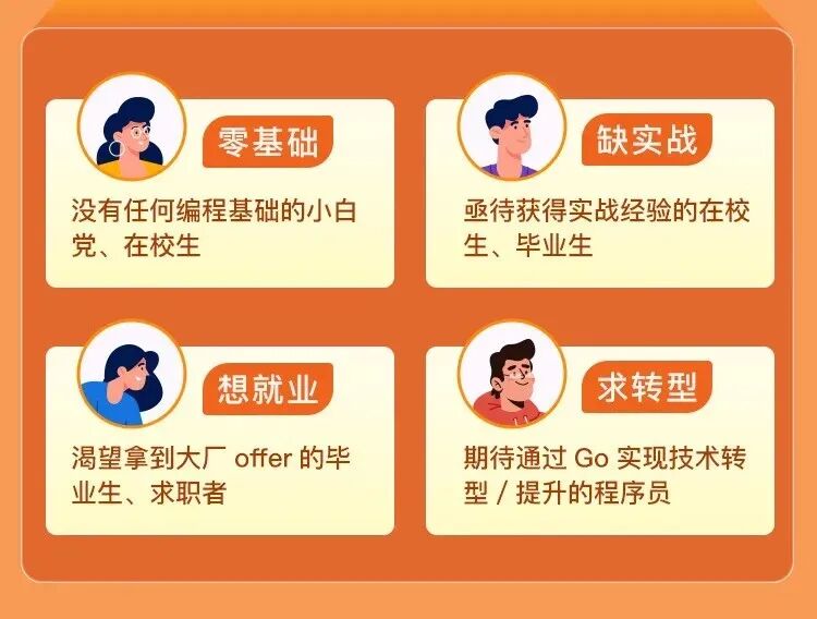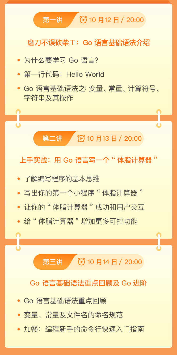 学习编写程序的基本思维,手把手教你用 Go 语言写出一个体脂计算器,并和用户成功交互,增加更多可控功能。现在报名,即可获得 Go 工程师技能图谱,让你在成为 Go 工程师的道路上对自己的能力一目了然,并了解一线企业招聘的 Go 工程师都需要具备哪些能力。除此之外,还有 Go 工程师就业资料包,内含算法 + Go + K8S 面试题,以及算法基础 + Go + Linux 知识技能图谱。