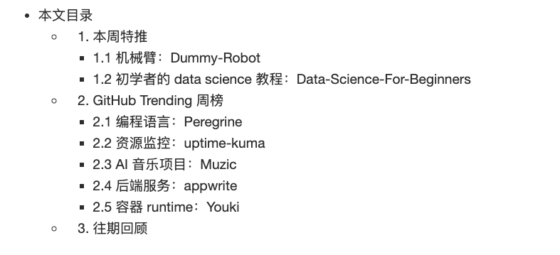 3. 往期回顾 以上为上周的 GitHub Trending 🎉如果你 Pick 其他好玩、实用的 GitHub 项目,记得来 HelloGitHub issue 区和我们分享下哟 🌝