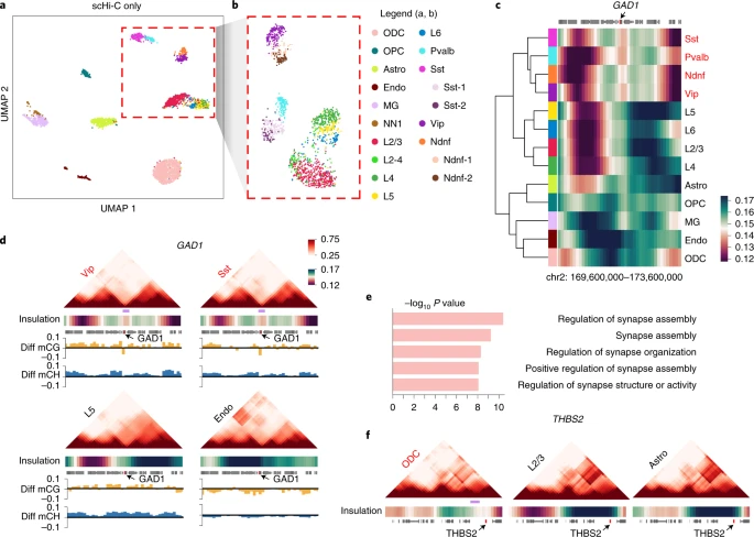他们还发现 SULF1 是区分 L6 亚型与其余兴奋性神经元亚型(L2/3、L4 和 L5)的标记基因,与周围细胞类型特异性 TAD 样域边界具有很强的相关性。TAD 样域边界存在于 93.2% 的 L6 细胞中,但其余的兴奋性神经元亚型中仅有 65.3%。这些结果为人类前额叶皮层细胞类型的标记基因调控以及 3D 基因组结构和功能之间的联系提供了新的见解。