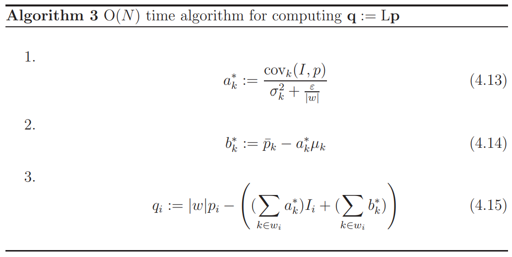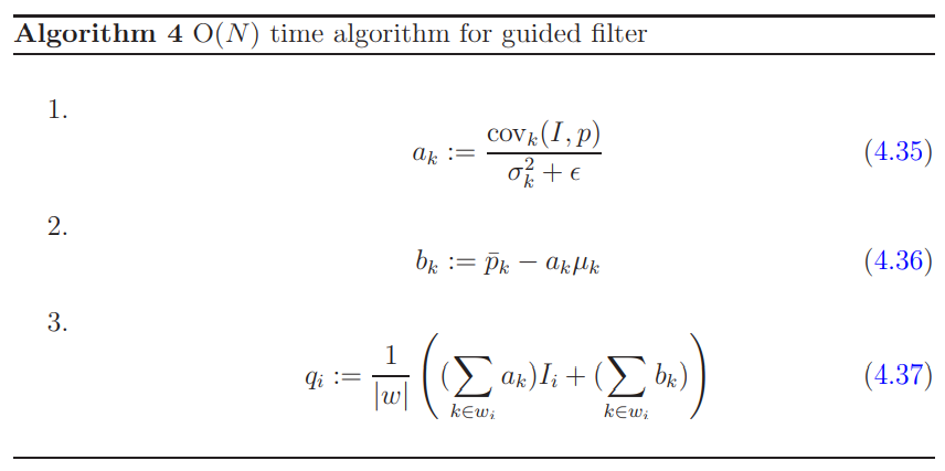 通过推导,guided filter只需要O(N)复杂度就能得到q,算法如下: