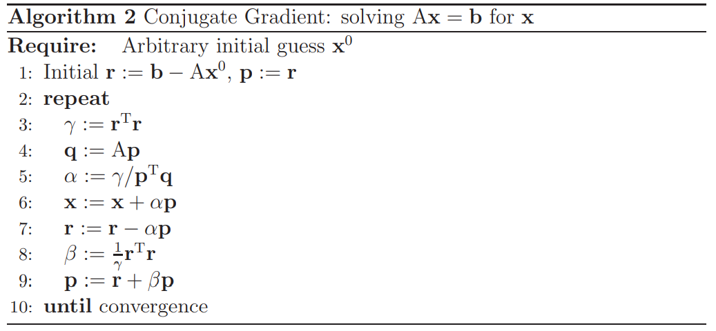 linear system一般可以通过Conjugate Gradients(CG)方法计算得到,算法如下: