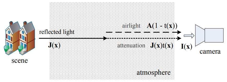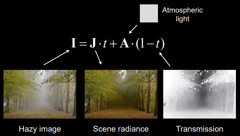 其中I是hazy image,J是scene radiance,A是atmospheric light,t是传递系数。可以理解为I是雾图,J是无雾图,A是空气光图,这样子看就跟image matting公式非常类似(无雾图是背景,空气光图是前景)。其中深度图可以通过公式 得到。