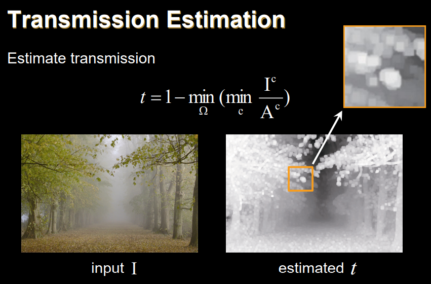 由dark channel prior规律对t进行近似。A可以通过图片10%最亮区域得到近似值。也就是A已知,可以求解出t。