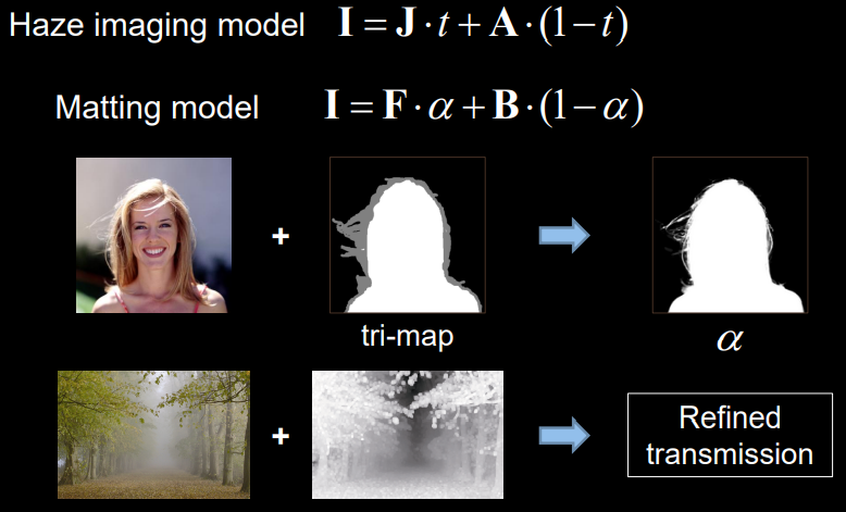 上面也说到,haze imaging model公式和matting model公式非常类似,而image matting一种常用的做法是,输入图片和trimap图片(包含三部分区域: 白色前景、黑色背景和灰色未知),用封闭式抠图算法得到alpha matting。仿照image matting的方式,图像去雾也可以通过输入图片和transmission图片(类似trimap图片),得到refined transmission(类似alpha matting)。