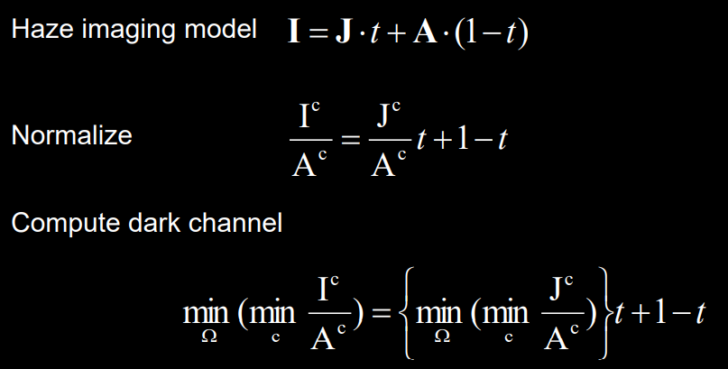 kaiming he通过大量无雾图片统计发现了dark channel prior—在无雾图的局部区域中,3个通道的最小亮度值非常小接近于0(不包括天空区域)。