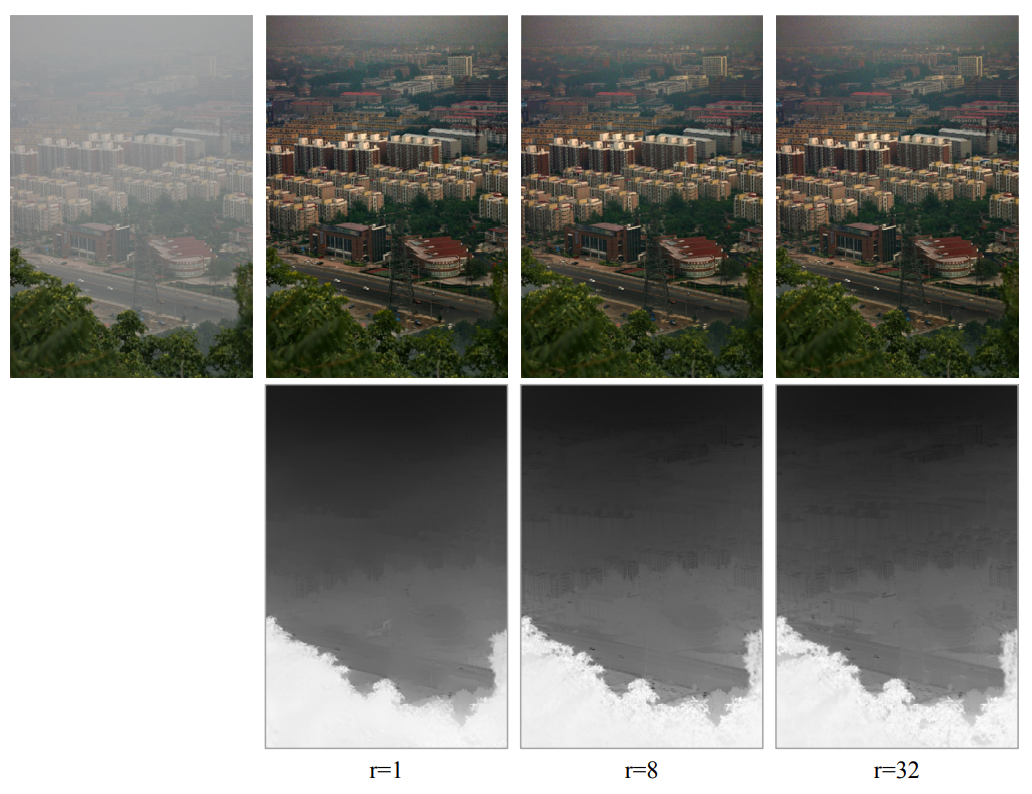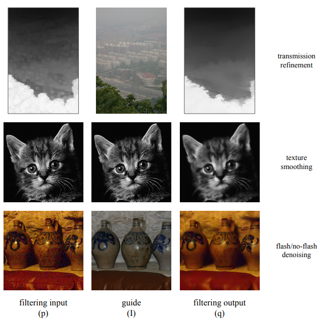 Guided image filtering是结合两幅图片信息的过程,一个filtering input image(表示为p)和一个guide image(表示为I)生成一个filtering output image(表示为q)。p决定了q的颜色,亮度,和色调,I决定了q的边缘。对于图像去雾来说,transmission就是p,雾图就是I,refined transmission就是q。