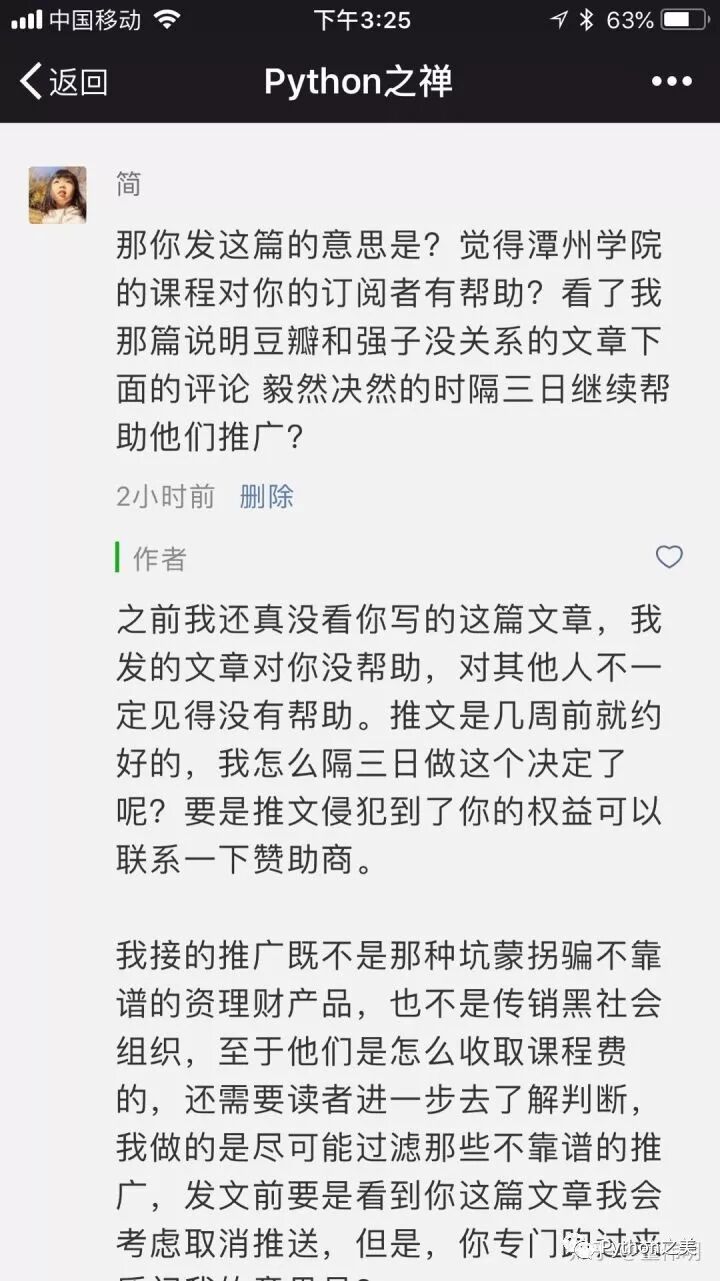各位可以扫一下,还是潭州教育... 那么我就假设「他并不知道我写的那篇 潭州Python学院创始人和豆瓣没有任何关系」,我直接去文章下发问: