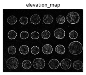 from skimage.filters import sobelelevation_map = sobel(coins)fig, ax = plt.subplots(figsize=(4, 3))ax.imshow(elevation_map, cmap=plt.cm.gray, interpolation='nearest')ax.axis('off')ax.set_title('elevation_map')Text(0.5, 1.0, 'elevation_map')