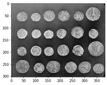 import numpy as npimport matplotlib.pyplot as pltfrom skimage import datacoins = data.coins()hist = np.histogram(coins, bins=np.arange(0, 256))fig, (ax1) = plt.subplots()ax1.imshow(coins, cmap=plt.cm.gray,interpolation='nearest')