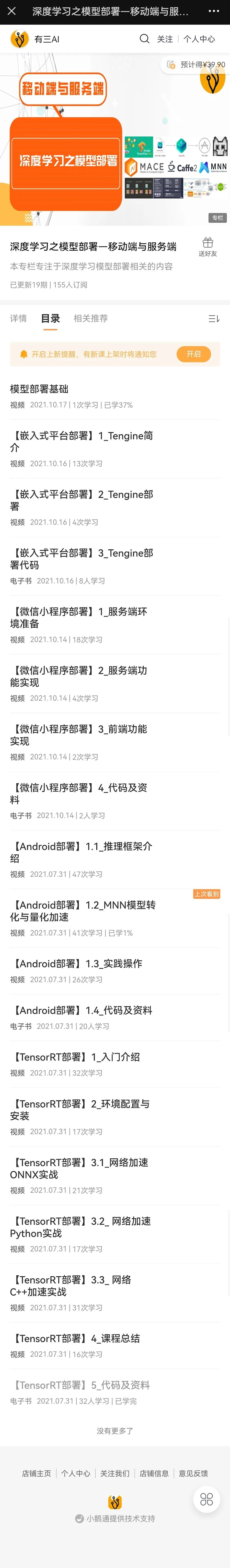 本次课程中一共已经包含了4个平台和框架案例,分别为Tengine与EAIDK嵌入式平台部署,TensorRT服务端模型优化与部署,微信小程序前后端部署,MNN与Android平台部署,后续还会增加其他硬件平台与部署框架。