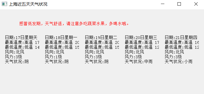今天小编来利用Python和PyQt5来一键生成未来五天内所在当地的天气预报,以便我们更好的来抵御寒冷,预防感冒。