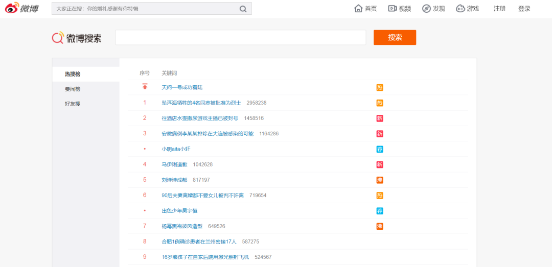import requestsimport re url = 'https://s.weibo.com/top/summary?cate=realtimehot' #微博网址 ret = requests.get(url) test = ret.text u_href = '.*? ' u_title = '(.*?) ' u_amount = '(.*?) ' u_category = ' (.*?)' u_href = '.*? ' title = re.findall(u_title,test) amount = re.findall(u_amount,test) category = re.findall(u_category,test) href = re.findall(u_href,test)