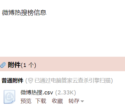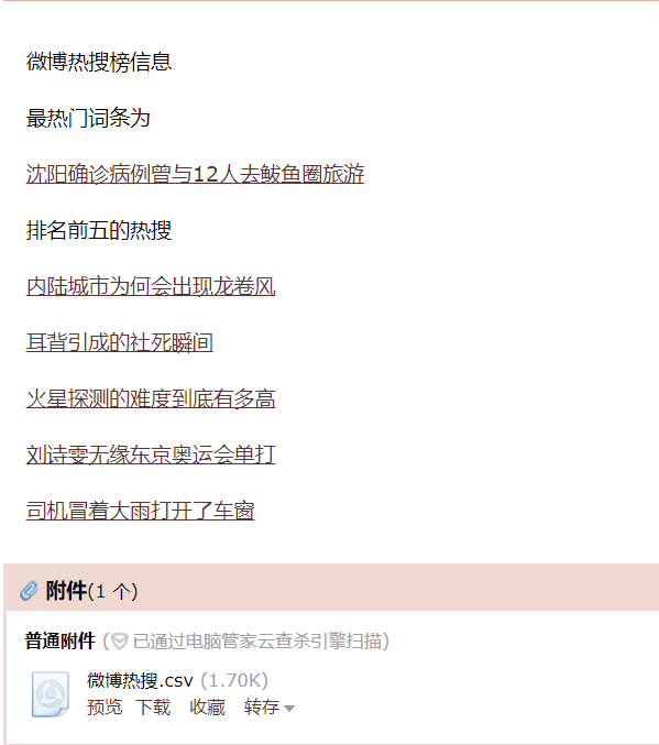 ''' .format(df.iloc[0 ,:]['href' ],df.iloc[0 ,:]['关键词' ], df.iloc[1 ,:]['href' ],df.iloc[1 ,:]['关键词' ], df.iloc[2 ,:]['href' ],df.iloc[2 ,:]['关键词' ], df.iloc[3 ,:]['href' ],df.iloc[3 ,:]['关键词' ], df.iloc[4 ,:]['href' ],df.iloc[4 ,:]['关键词' ], df.iloc[5 ,:]['href' ],df.iloc[5 ,:]['关键词' ]) mer.attach(MIMEText(head, 'html' , 'utf-8' )) fujian = MIMEText(open('微博热搜.csv' , 'rb' ).read(), 'base64' , 'utf-8' ) fujian["Content-Type" ] = 'application/octet-stream' #附件内容 fujian.add_header('Content-Disposition' , 'file' , filename=('utf-8' , '' , '微博热搜.csv' )) mer.attach(fujian) mer['Subject' ] = '每日微博热搜榜单' #邮件主题 mer['From' ] = number #发送人 mer['To' ] = to #接收人 # 5.发送邮件 s = smtplib.SMTP_SSL('smtp.qq.com' , 465 ) s.login(number, smtp) s.send_message(mer) # 发送邮件 s.quit() print('成功发送' )