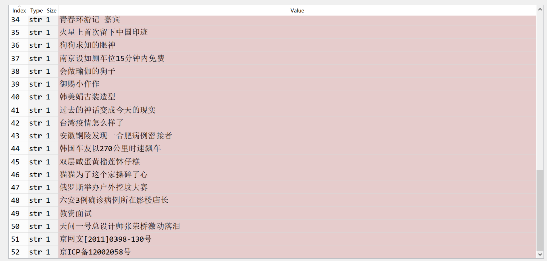 总共只有50条热搜,怎么多出来3条?可以看到最后的两条是不需要的,所以用列表提取的方法提取前50行。还有一个元素多出来?就是我们的第一个元素,即是title[0],title[0]是没有序号与热搜搜索量的,如图: