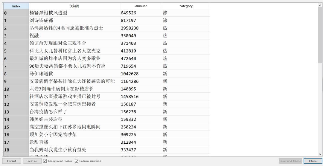 import pandas as pd title = title[:-2 ] title = title[1 :] href = href[:-2 ] href = href[1 :]for j in range(len(href)): href[j] = 'https://s.weibo.com/' + href[j]while '' in amount: amount.remove('' )for i in range(len(category)): if category[i] != '' : category[i] = re.findall('(.*?) ' ,category[i])[0 ] if category[i] == '' : category[i] = '空' category = category[1 :]while '荐' in category: category.remove('荐' ) df = pd.DataFrame() df['关键词' ] = title df['amount' ] = amount df['category' ] = category df['href' ] = href df = df.sort_values('amount' ) df2 = df[df['category' ]=='爆' ] df3 = df[df['category' ]=='沸' ] df4 = df[df['category' ] == '热' ] df5 = df[df['category' ] == '新' ] df6 = df[df['category' ] == '空' ] df = pd.concat([df2,df3,df4,df5,df6],ignore_index = True ) df.to_csv('微博热搜.csv' ,encoding = 'gbk' )#输出为csv文本格式