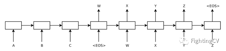 在机器翻译的上下文中,这样一个 seq2seq 任务将涉及到将一个输入序列 i = { a,b,c,< eos > }转换成一个不同长度的输出序列 o = { w,x,y,z,< eos > }。对于一个未经Attention的基于 RNN 的编解码器架构,展开每个 RNN 将产生以下图形: