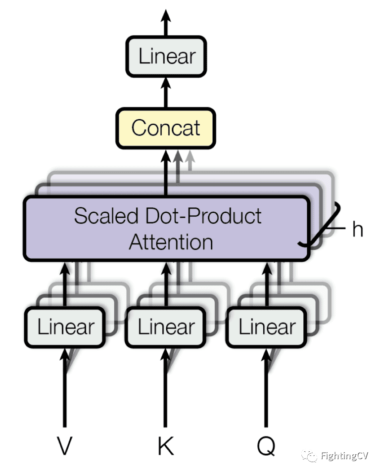 此外,几个注意力层可以并行地堆叠在一起,这被称为多头注意力。每个头在同一个输入的不同线性变换下平行工作,然后将头的输出concat起来产生最终的注意结果。拥有多头模型的好处是每个头可以关注序列的不同元素。